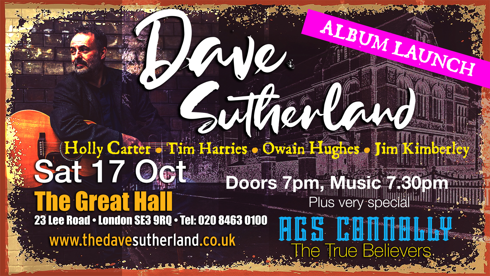 Following his sell-out show in the Hearn Recital Room last year, Dave Sutherland returns to launch his highly anticipated new album, ‘Just Like a Black and White Film‘ in this special event with special guests Ags Connolly and The True Believers.