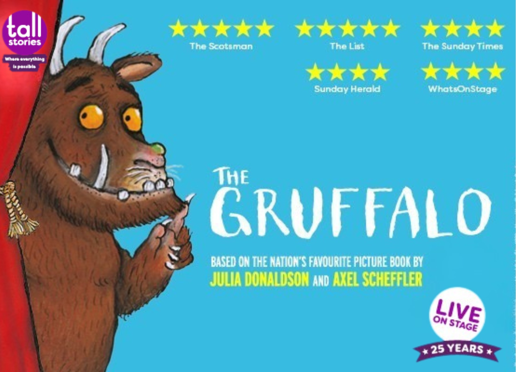 Tall Stories’ much-loved magical, musical adaptation of the classic picture book by Julia Donaldson and Axel Scheffler returns by popular demand, celebrating the show’s 25th anniversary.